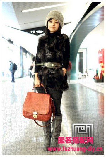 皮草的帽子以及皮草的背心,搭配起来很有冬天的感觉,只是红色复古手袋的加入有些突然。