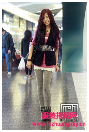 皮草马甲是这季不能错过的,灰色的袜子中和了黑色与粉色的跳跃。