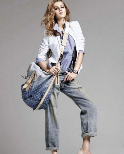 搭配介绍:整体造型得到了搭配中少有的统一性,白色上衣,蓝色衬衫,半褪色旧仔裤,显得清爽大方而不失格调。渐变色LV包包是造型的绝对亮点,既运用了今年的流行元素,又与整体造型相呼应。提醒爱美的MM,怀旧的泛白牛仔也是今年的大热呢。
